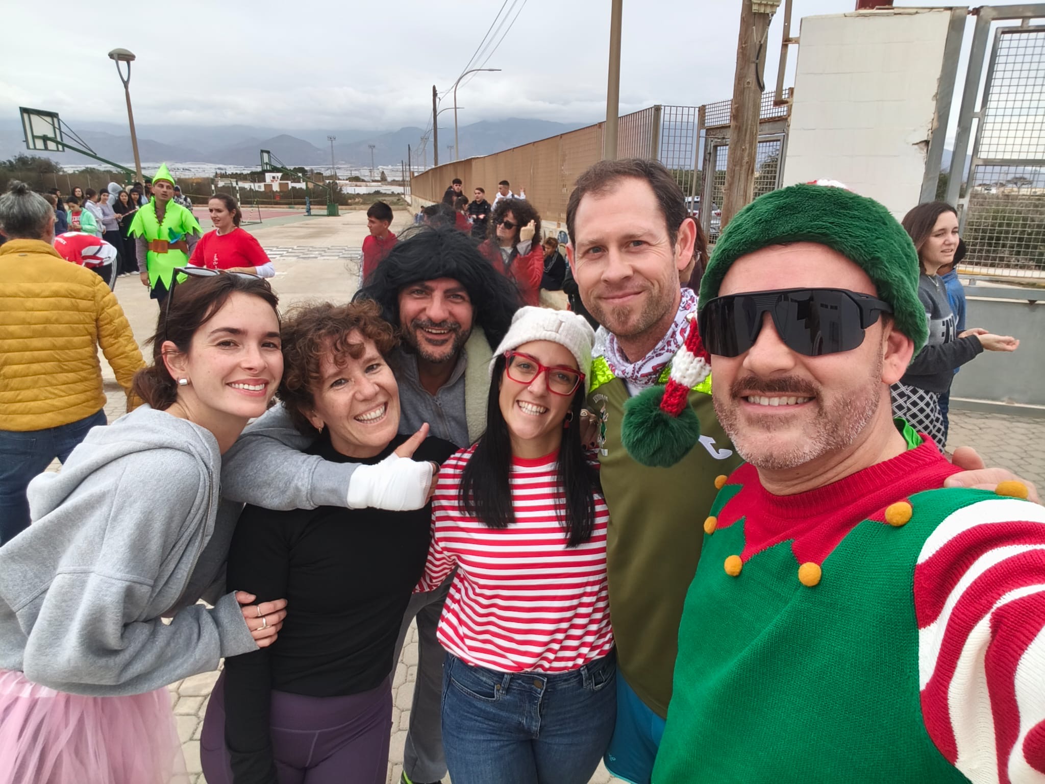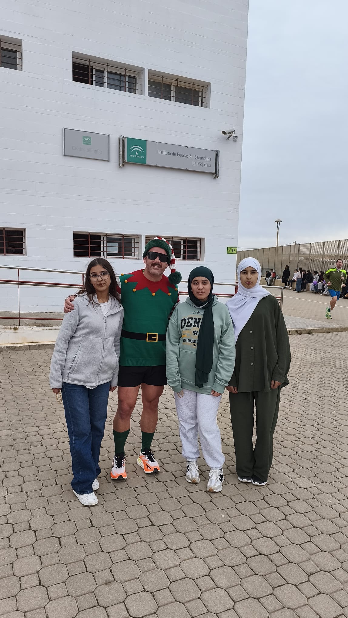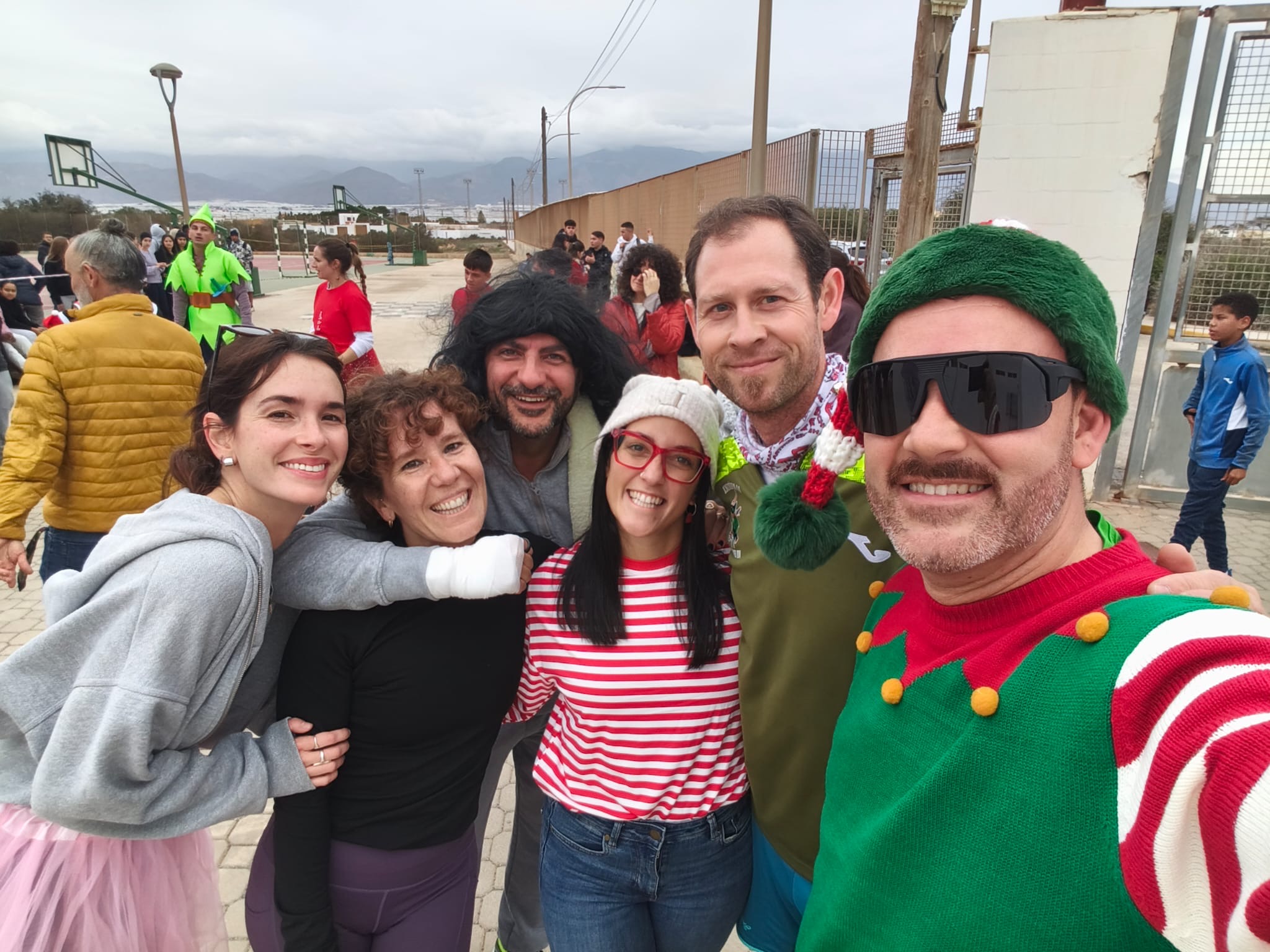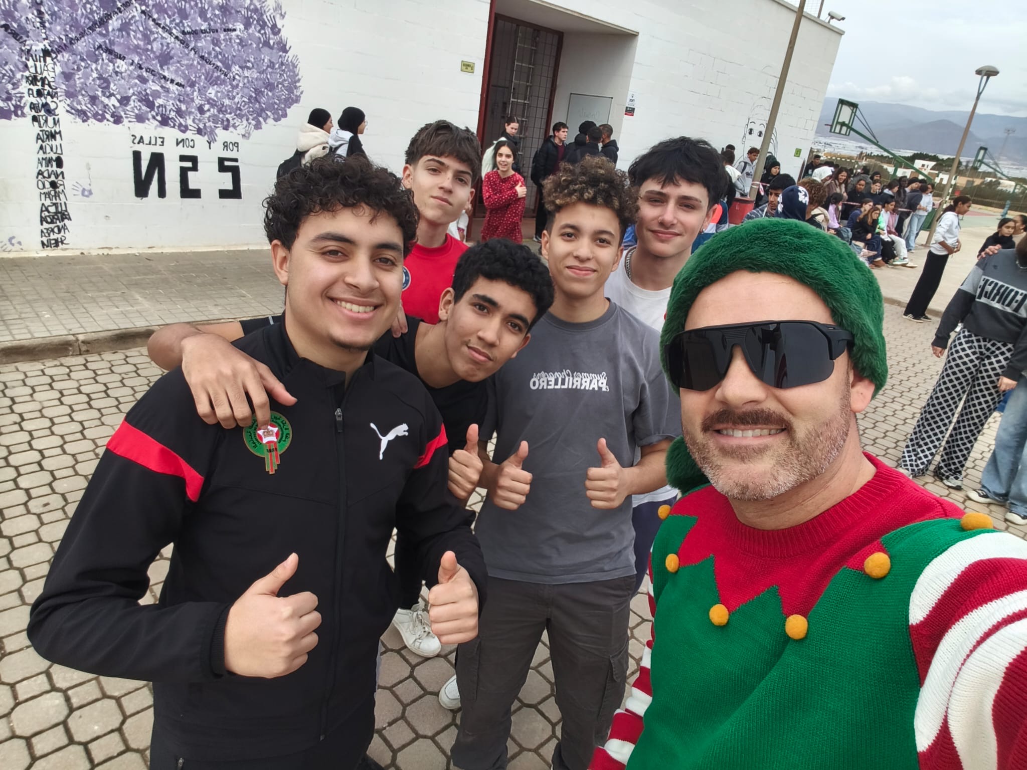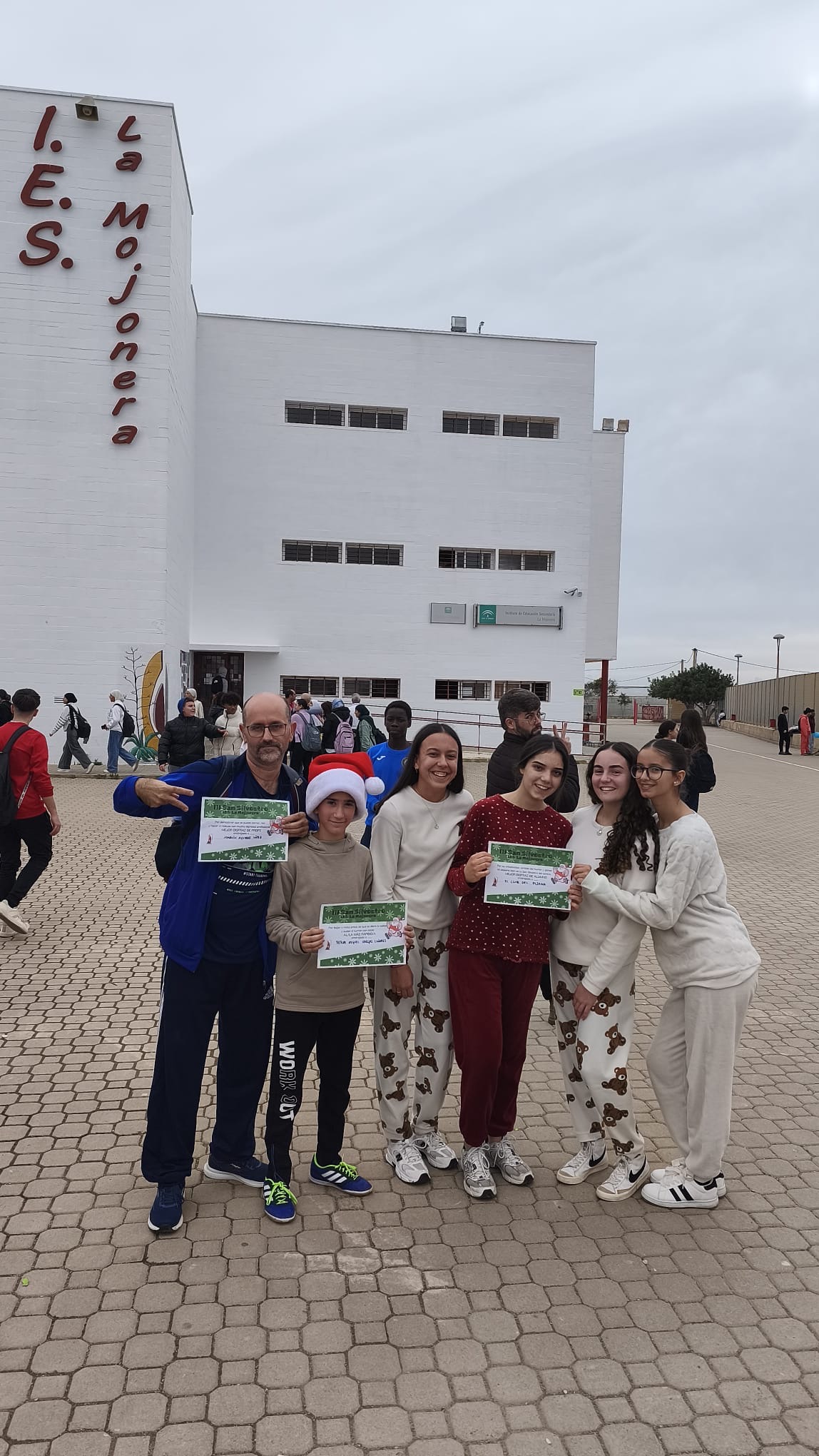 «Un año más, el centro organiza la Carrera San Silvestre el último de día de clase antes de las vacaciones de Navidad. Se trata de la tercera edición, donde el alumnado y el personal del centro se han disfrazado para echar un buen rato y participar en esta actividad de convivencia diferente y divertida. Además hubo premios al mejor disfraz y al más rápido. Agradecimiento especial al departamento de Educación Física por organizar el recorrido incluyendo algunos obstáculos para disfrutar aún más del evento.»