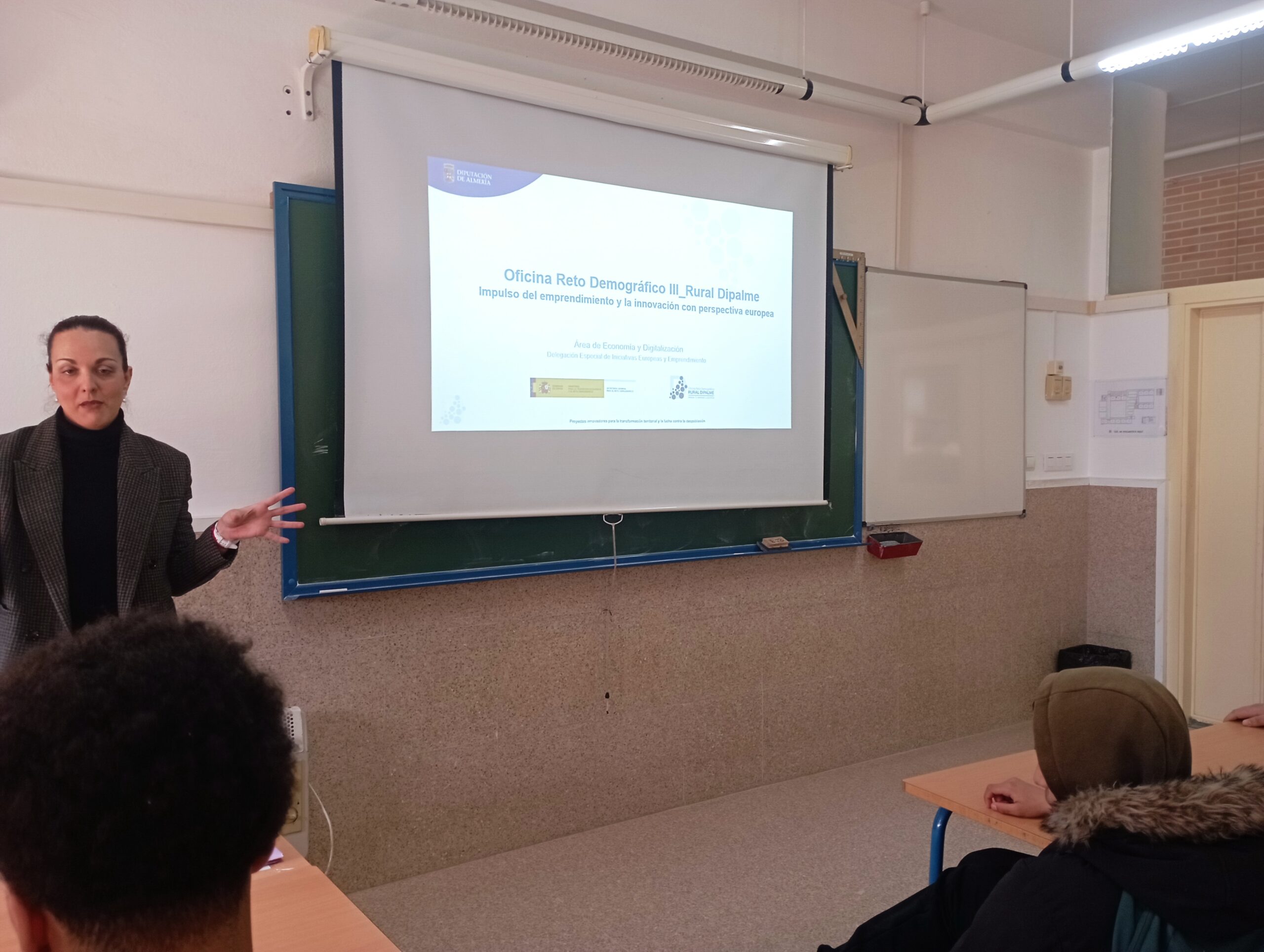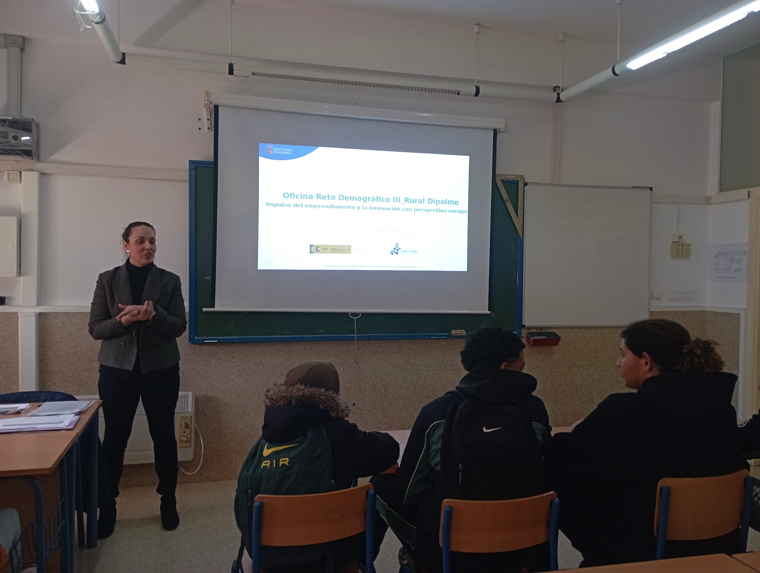 En el marco del Programa de emprendimiento educativo y dentro del Proyecto «Oficina Reto Demográfico III RURAL DIPALME» el alumnado de 1° de CFGB de Servicios Administrativos y de 1° de CFGM de Actividades comerciales, han recibido hoy un taller para el fomento del emprendimiento y la innovación con perspectiva europea de la Oficina Reto Demográfico III Rural Dipalme.